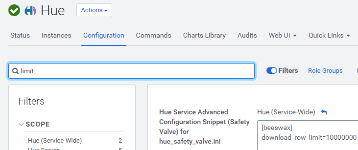 hue_safety_valve.ini 에 download_row_limit 을 변경한다.